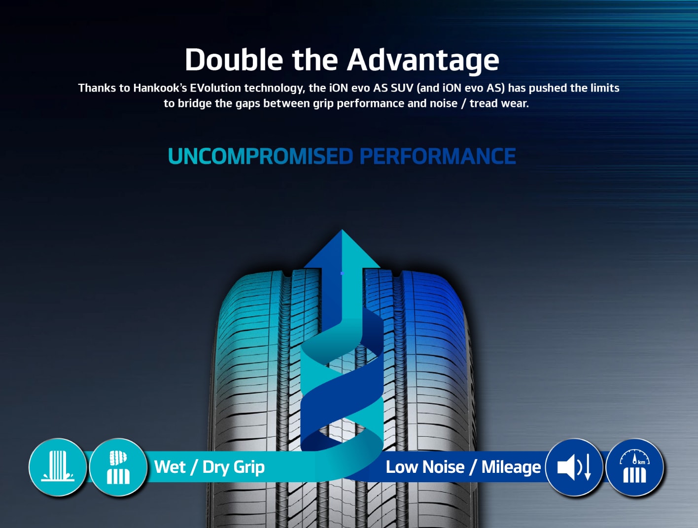Thanks to Hankook Tire's iON INNOVATIVE TECHNOLOGY, the iON evo AS SUV has pushed the limits to bridge the gaps between grip performance and noise/tread wear.