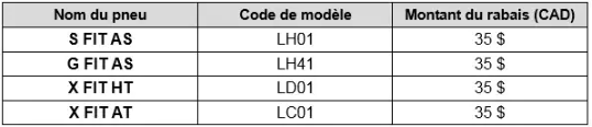 Afin d’être admissible à ce rabais, le consommateur doit acheter un jeu de quatre (4) pneus toutes saisons neufs chez un détaillant participant au Canada entre le 15 mars et le 31 mai 2017. Les modèles sélectionnés et les remboursements associés sont énumérés ci-dessous :