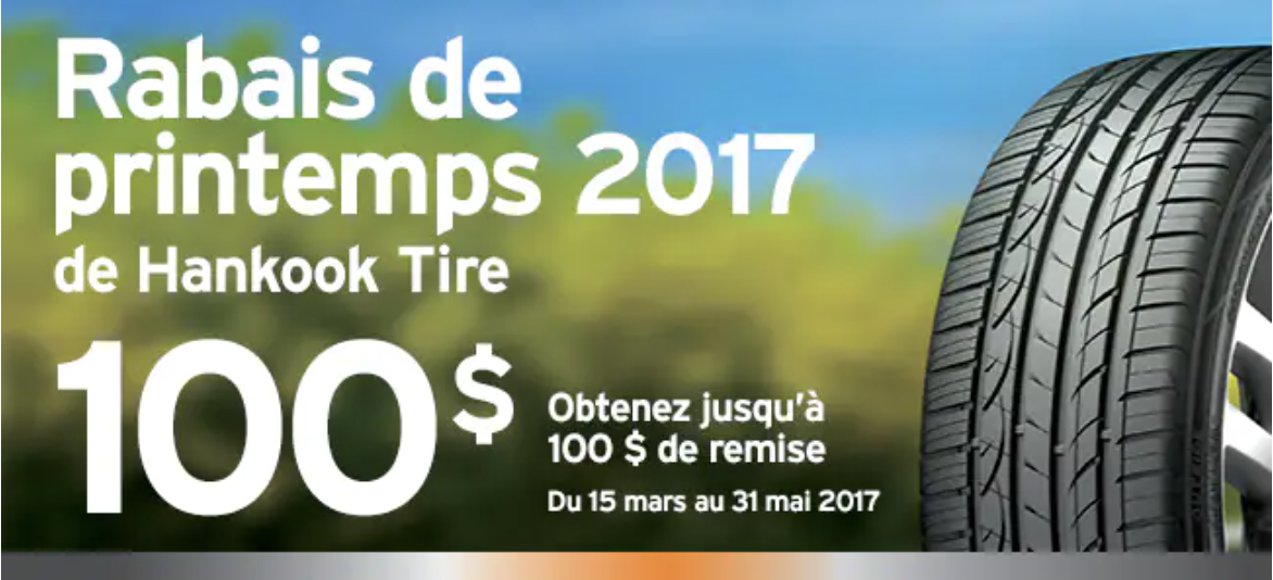 BRAMPTON, ON – 9 novembre 2016 - Hankook Tire Canada Corp. est ravie d’annoncer que le Rabais Hankook du printemps 2017 est offert aux clients canadiens. Le rabais est offert à tous les consommateurs canadiens pour une durée limitée sur tous les pneus de rechange d’Hankook, y compris les pneus ultra haute performance comme le pneu Ventus S1 evo2 (K117A), le modèle populaire Dynapro AT-m (RF10) et le pneu Kinergy GT (H436). Les clients qui achètent des pneus de marque Laufenn auront aussi droit à un rabais.