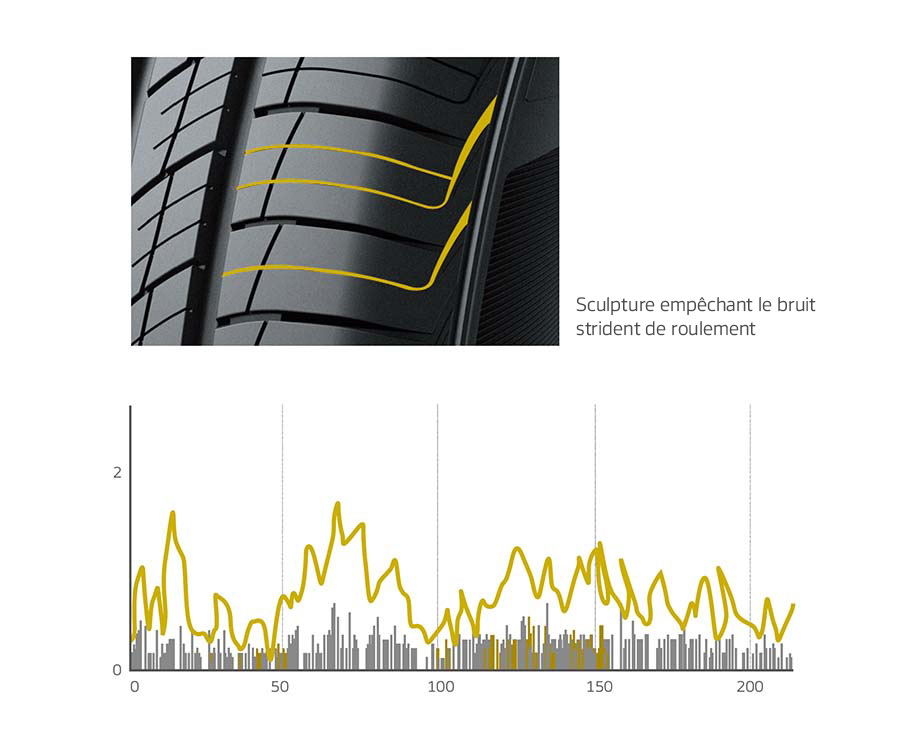 Des lamelle inclinée renforcent la maniabilité et la stabilité de conduite sur sol mouillé et offrent une meilleure durabilité. Des rainures latérales améliorent la résistance à l’hydroplanage.