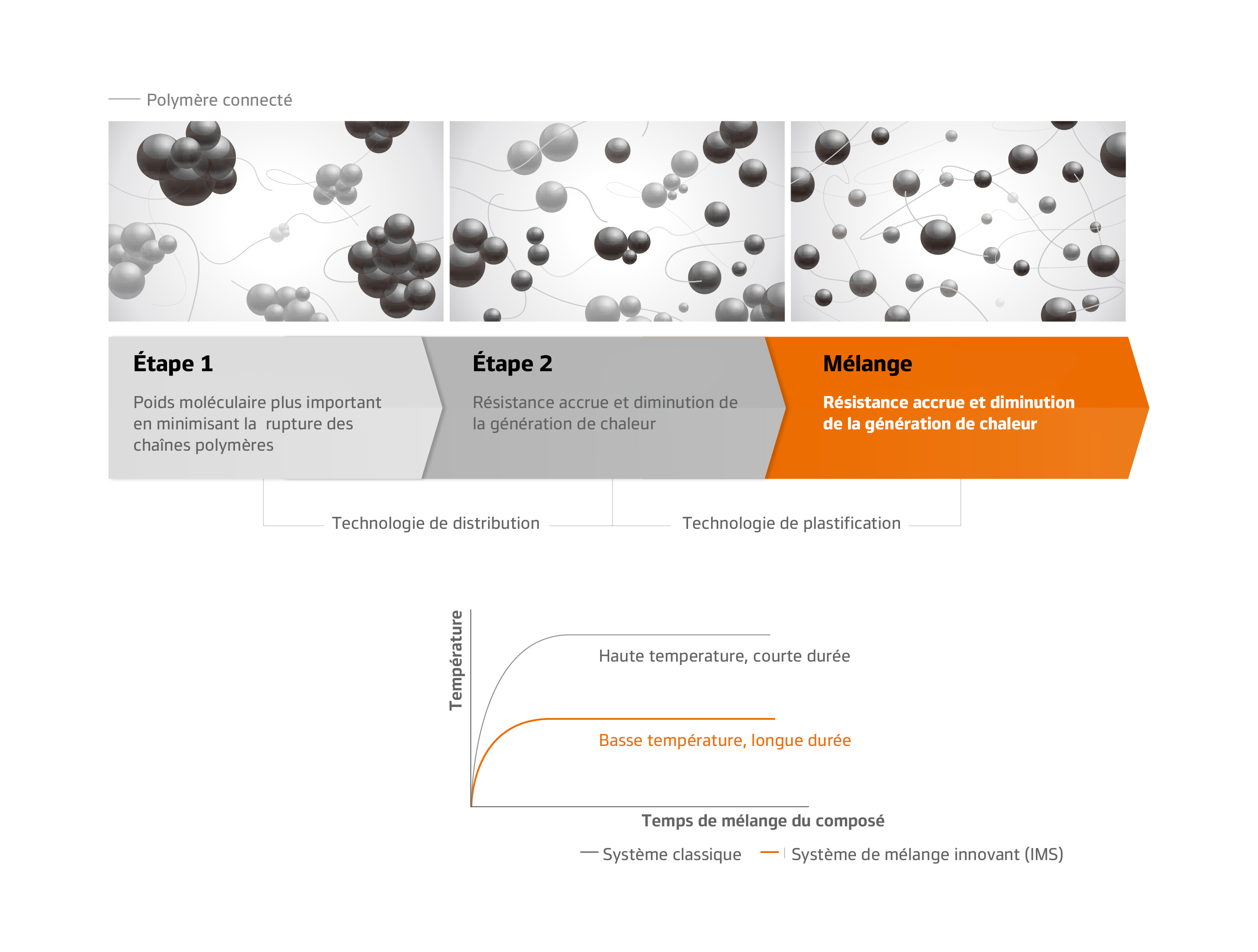 Système de mélange innovant (IMS) minimise la rupture et l'oxydation des chaînes de polymères et présente un degré de dispersion plus élevé du noir de carbone. Les effets de l'IMS contribuent à renforcer la force d'adhérence entre le noir de carbone et le caoutchouc pour un kilométrage plus long et à réduire la production de chaleur des composés pour un meilleur rendement énergétique.
