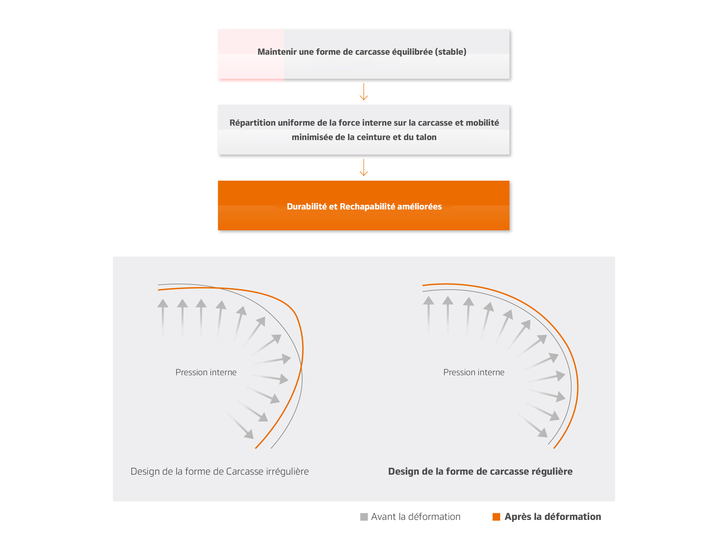 Technologie SCCT est conçue pour éviter une déformation constante du profil. Si le profil de la carcasse ne peut pas être maintenu constant, la force interne sur la carcasse sera concentrée sur un point spécifique (bord de ceinture ou de carcasse). En revanche, la technologie SCCT contrôle la dispersion de la force interne pour une meilleure durabilité.