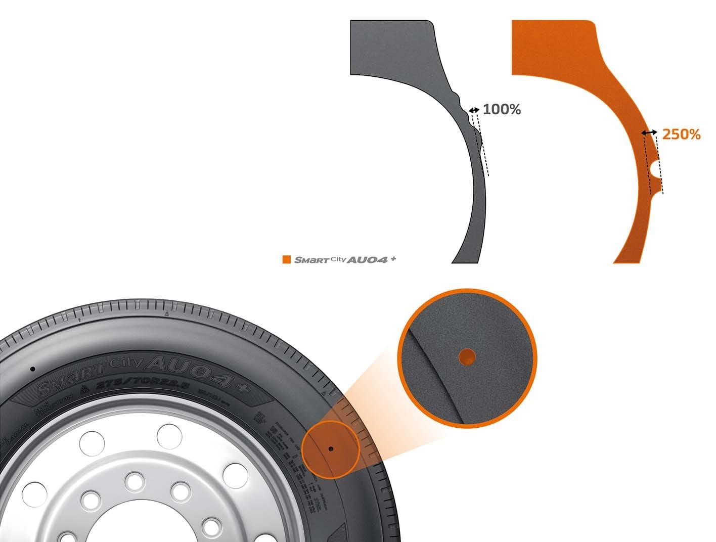 (SCCT Technology)Technologie SCCT est conçue pour éviter une déformation constante du profil. Si le profil de la carcasse ne peut pas être maintenu constant, la force interne sur la carcasse sera concentrée sur un point spécifique (bord de ceinture ou de carcasse). En revanche, la technologie SCCT contrôle la dispersion de la force interne pour une meilleure durabilité.