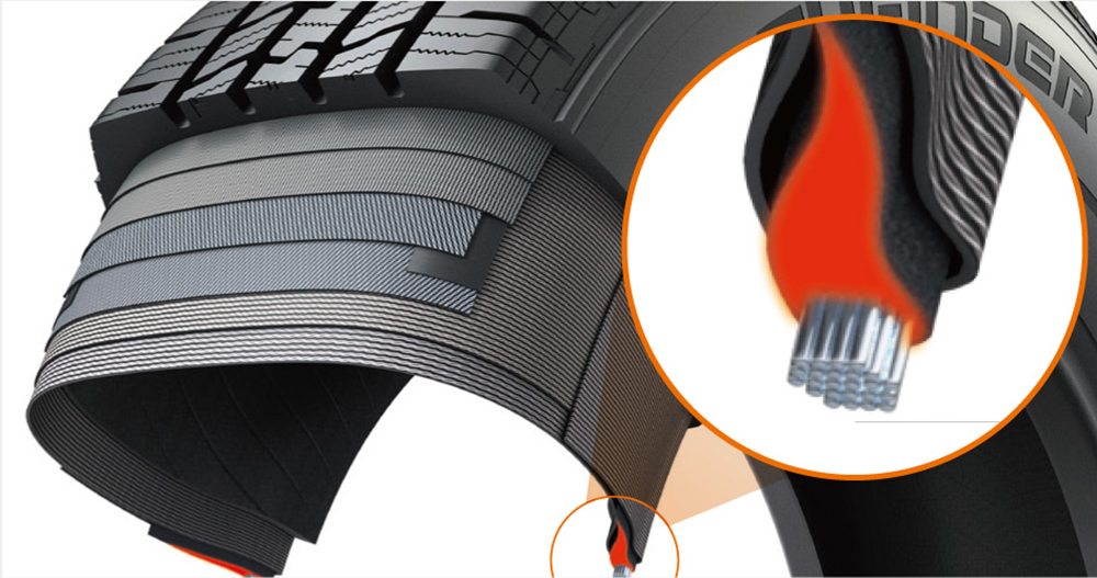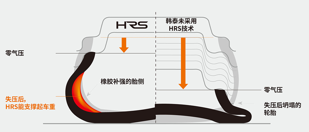 韩泰轮胎的“HRS缺气保用技术”(Hankook Runflat System)就是为了能在爆胎或迅速失压时保持较为安全的行驶而研发的。使用韩泰缺气保用技术的轮胎失压后,可以继续行驶一段距离,以便寻找附近的汽修店进行修理。