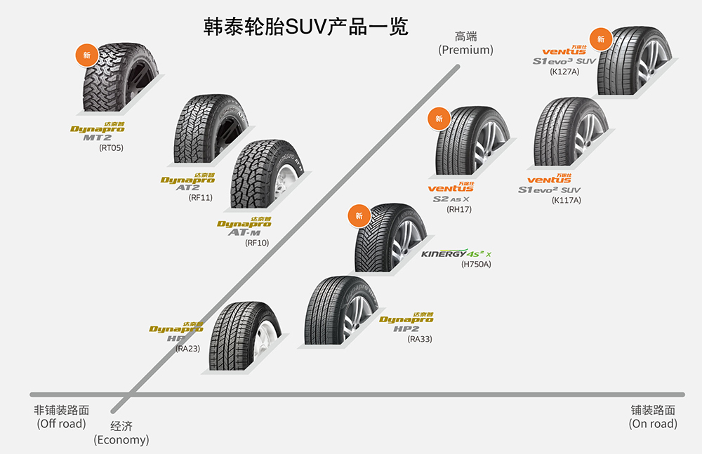 韩泰轮胎作为全球知名轮胎企业,多年来大力发展SUV轮胎,不仅有适用于非铺装路面的越野专用轮胎,更有多款以铺装路面为主要使用场景的城市SUV用轮胎,能够覆盖各类SUV产品的轮胎需求。尤其是Ventus系列的Ventus S1 evo3 SUV(K127A)、Ventus S1 evo2 SUV(K117A)、Ventus S2 AS X(RH17)三款为城市型SUV打造的高端轮胎产品,在城市型SUV市场的迅猛增长中成为多个汽车品牌的原装配套选择,并赢得了大量用户的青睐。