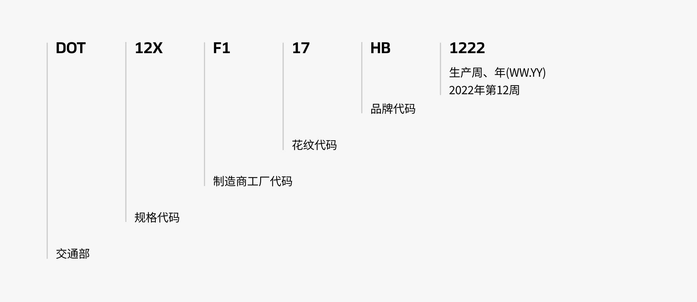 “DOT”字符代表轮胎制造商符合美国交通部(DOT)国家公路交通安全管理局(NHTSA)的轮胎安全标准。美国制造的轮胎,DOT序列号模刻在轮辋附近的内侧胎壁上。“DOT”后边的8~13字母和/或数字,用于标识轮胎的生产地、规格和制造商代码,以及制造周和年份。