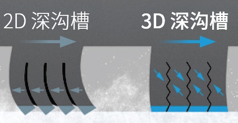 3D 冬季深沟槽和 V 型加宽沟槽设计,在冰面、湿地、干地路面等条件下,提供更强的制动性及转向性 。