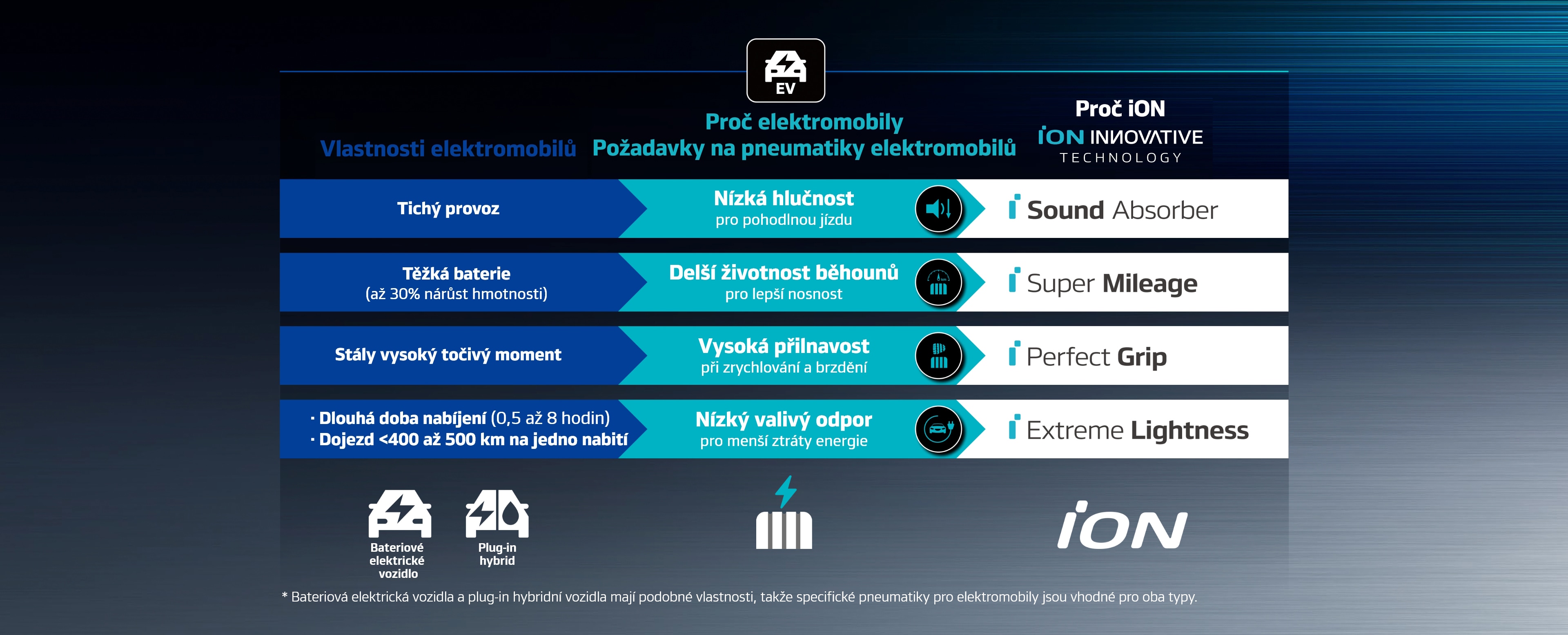 Elektromotory jsou téměř bezhlučné, což znamená, že řidič více vnímá hluk pneumatik. Díky technologii i Sound Absorber nabízí pneumatika iON ST AS SUV tichou a příjemnou jízdu při všech rychlostech.