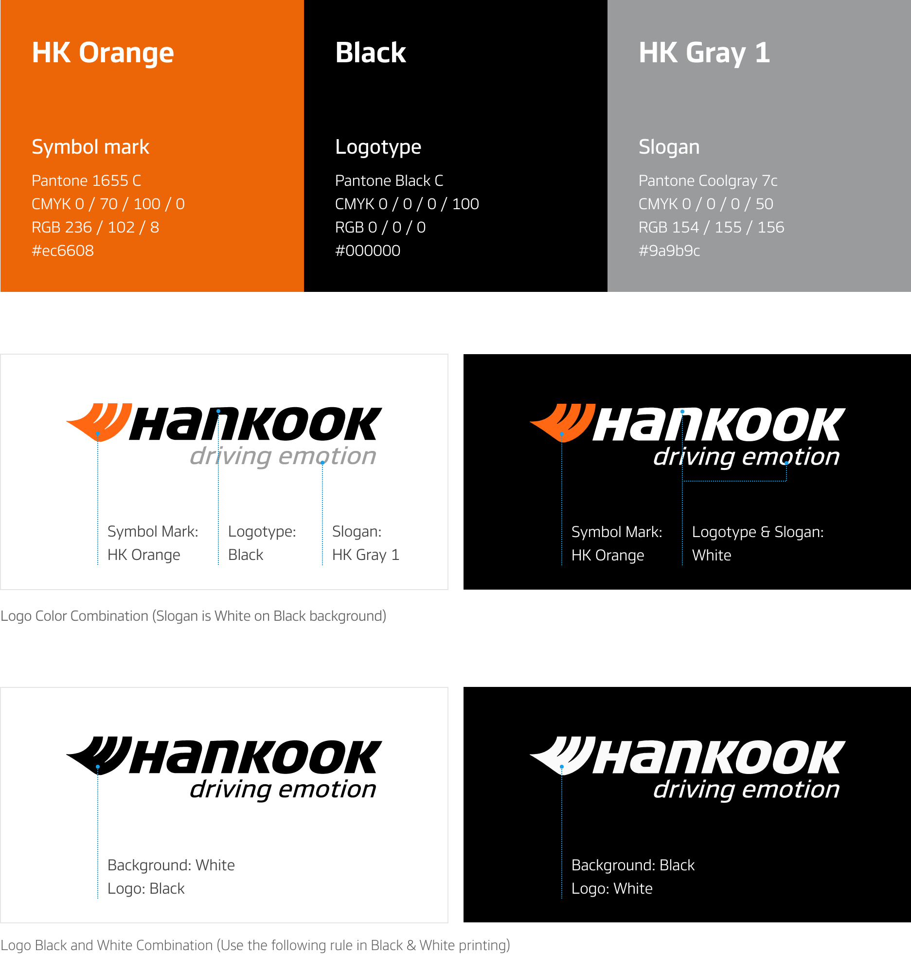 The colors of Hankook Tire & Technology are orange and black.* When printing, spot colors should be set by default, but if the spot colors are not available, the CMYK colors of Process Color may be used as alternatives.