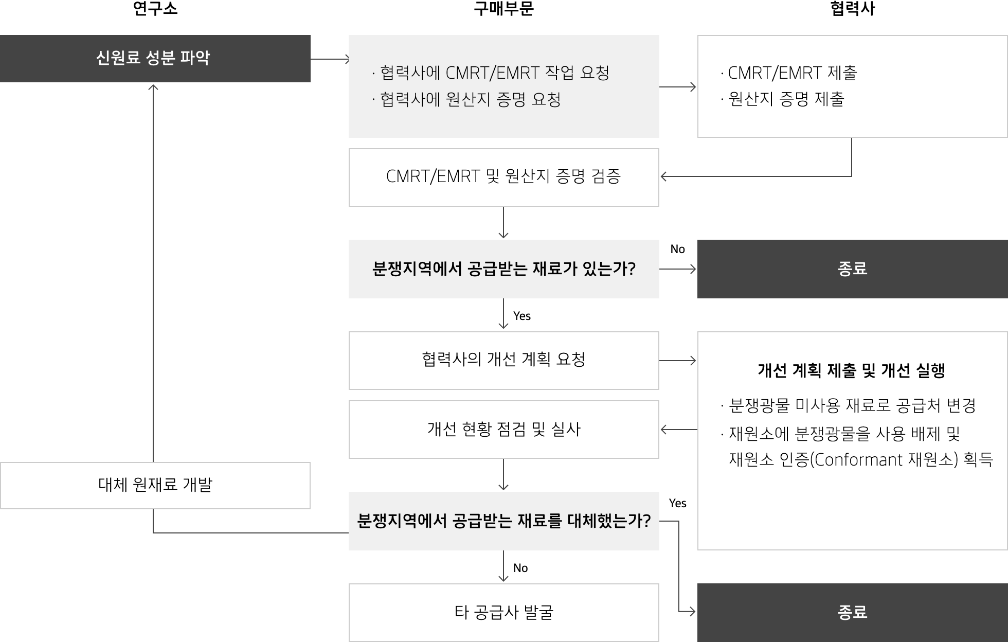 회사는 RMI(Responsible Minerals Initiative) 및 OECD 실사지침(OECD Due Diligence Guidance)을 기반으로 공급망을 평가·관리하며, 고객 및 이해관계자의 요구에 부합하는 투명한 조달활동을 수행합니다.