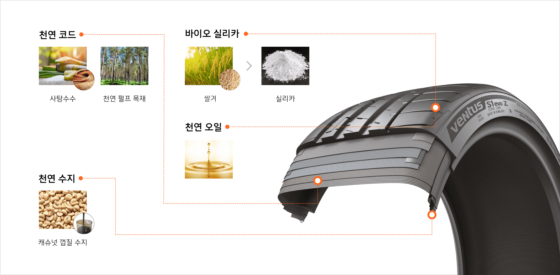 한국타이어앤테크놀로지는 아래와 같이 다양한 지속가능한 원료를 개발하고 타이어에 적용함으로써 이산화탄소 배출을 줄이고 천연자원의 고갈을 방지하는데 기여하고 있습니다.