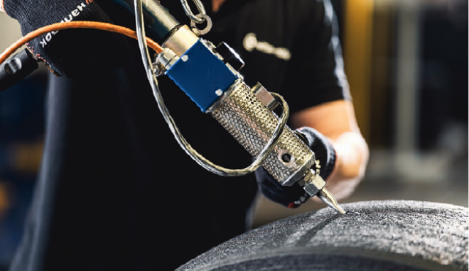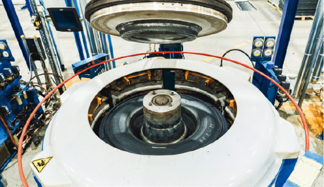 Lo stampo di vulcanizzazione crea il nuovo battistrada e i fianchi, conferendo allo pneumatico Alphatread una finitura pari al nuovo. Si tratta dello stesso processo utilizzato per gli pneumatici premium Hankook.