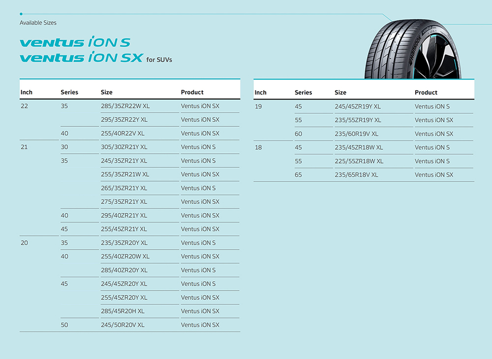Ventus iON Sは転がり抵抗の減少、低騒音で高い快適性能、耐荷重性能などの特徴を持ち合わせます。弊社従来品のタイヤに比べて、EV車両に対し長距離を走行でき、高荷重で静かな電気自動車の特性に合わせて設計されました。