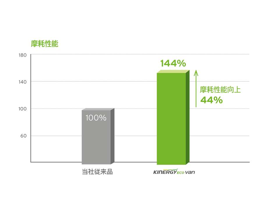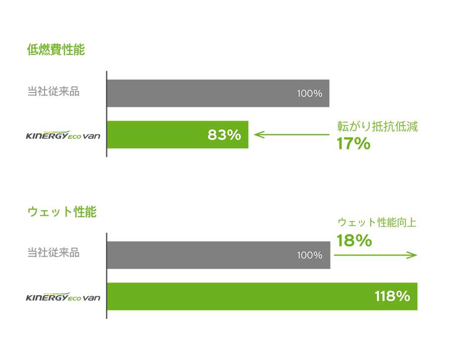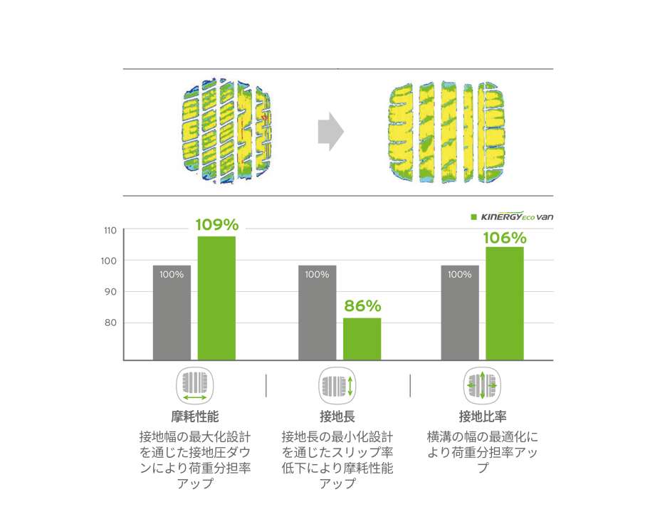 タイヤの接地長を最小化した正方形プロファイルを適用し、優れた摩耗性能を実現しました。転がり抵抗は全サイズ「A」を獲得しています。