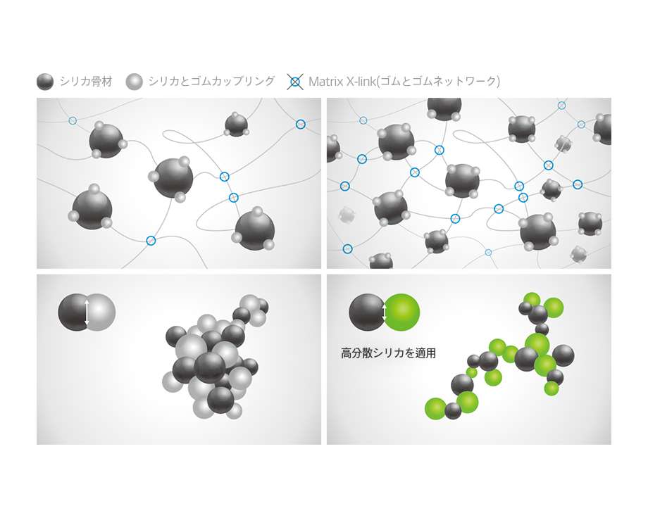 高分散シリカコンパウンド配合技術により、高い水準のウェット性能を保有しながらゴムの発熱を抑え、当社従来品に比べ転がり抵抗を18%低減させました。 タイヤを構成する重量バランスを最適化し、エネルギー損失を削減させました。