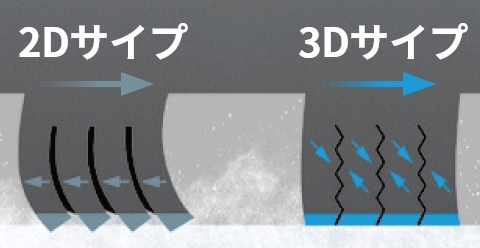 3DウインターサイプとV字の幅広グルーブは凍った路面や、濡れた路面から乾いた路面まで高いブレーキ性能を発揮します。
