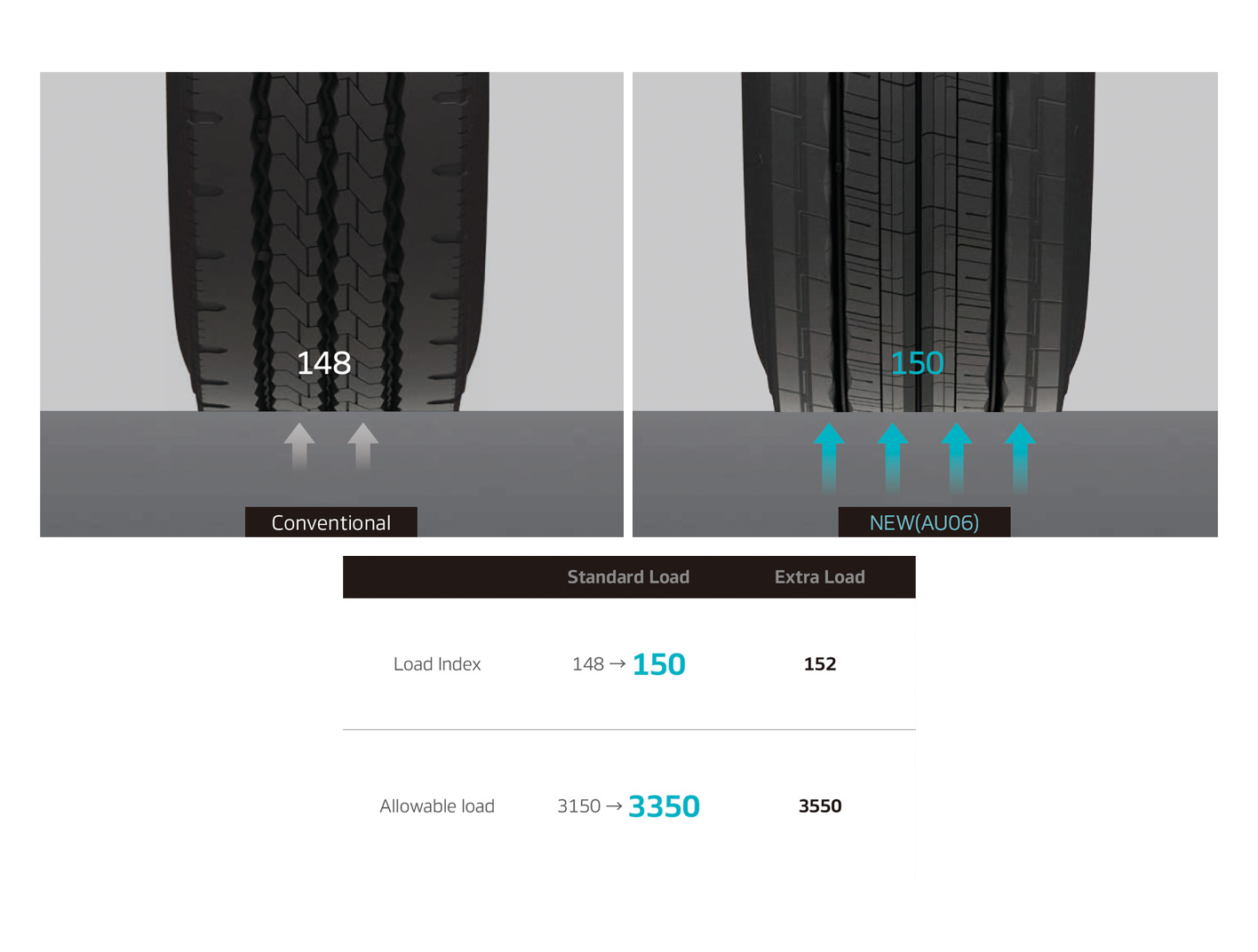 전기차 가속, 선회, 제동 등 어떠한 주행환경에서도 최적의 접지형상을 유지합니다. 또한 Old(AU81)의 하중지수 대비 New(AU06)의 상향된 하중지지능력을 확보했습니다.