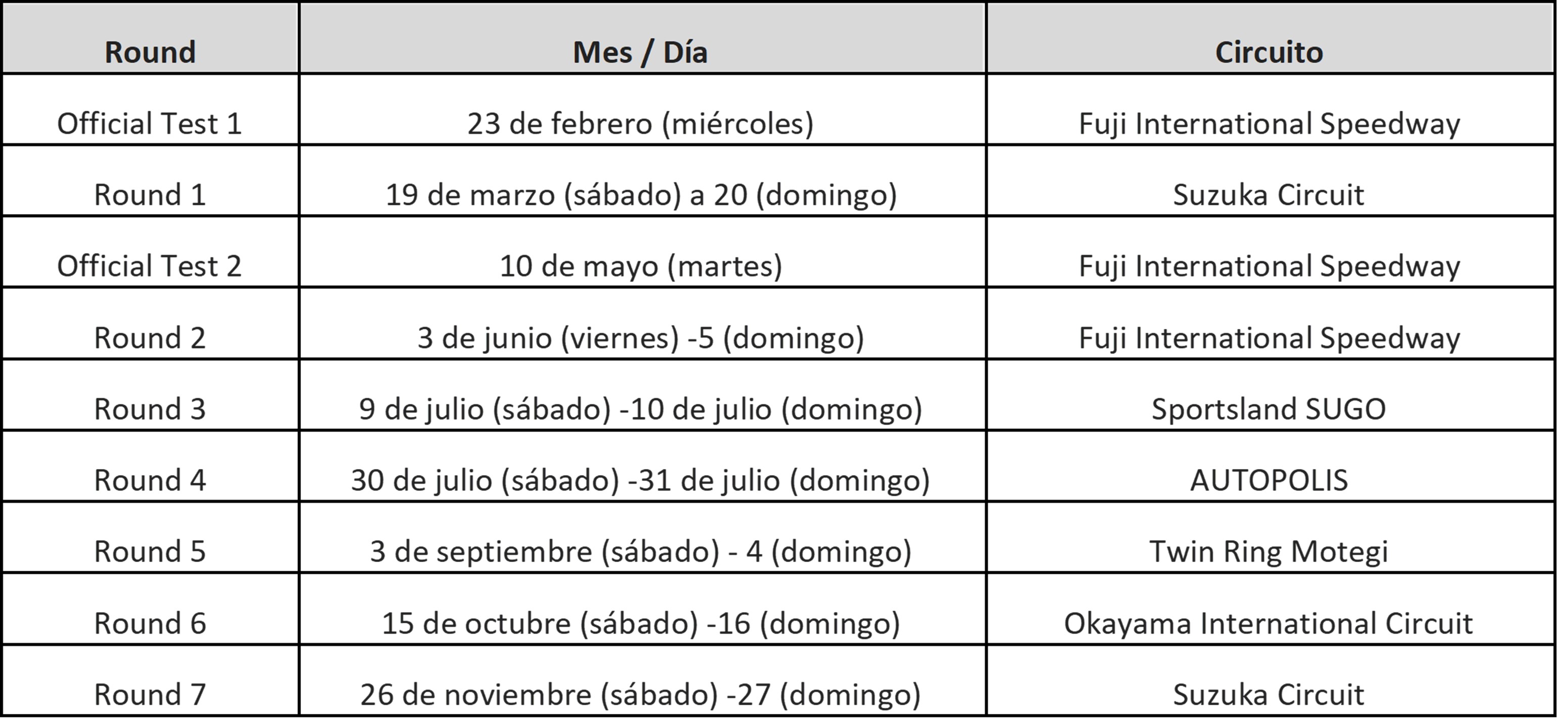Continuando desde el Fuji Speedway, la temporada continúa hasta el 27 de noviembre. Se realizarán seis rondas más en diferentes circuitos como Sportsland SUGO, Autopolis, Mobility Resort MOTEGI y el Circuito Internacional de Okayama.