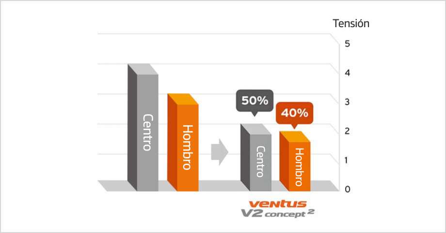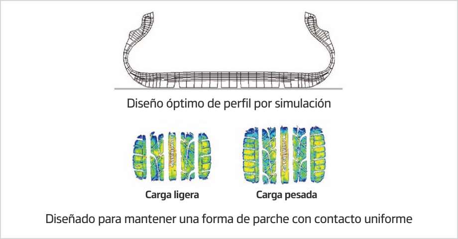 Mejora la estabilidad durante la conducción simulada a alta velocidad mediante la utilización de un óptimo perfil en el diseño para lograr una forma de la huella en el contacto uniforme, minimizando la deformación del centro y el hombro.
