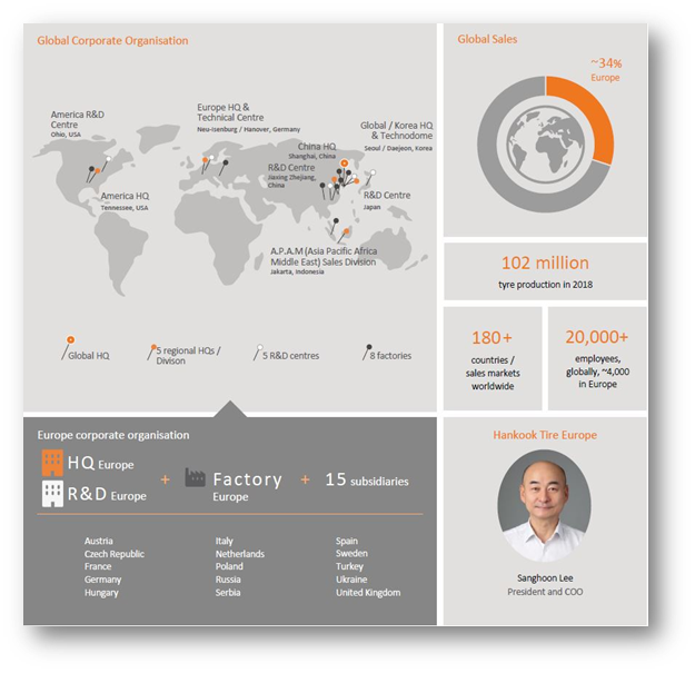 - Hankook Tire is continuously investing in research and development and maintains five R&D centers and eight large scale production facilities around the globe.