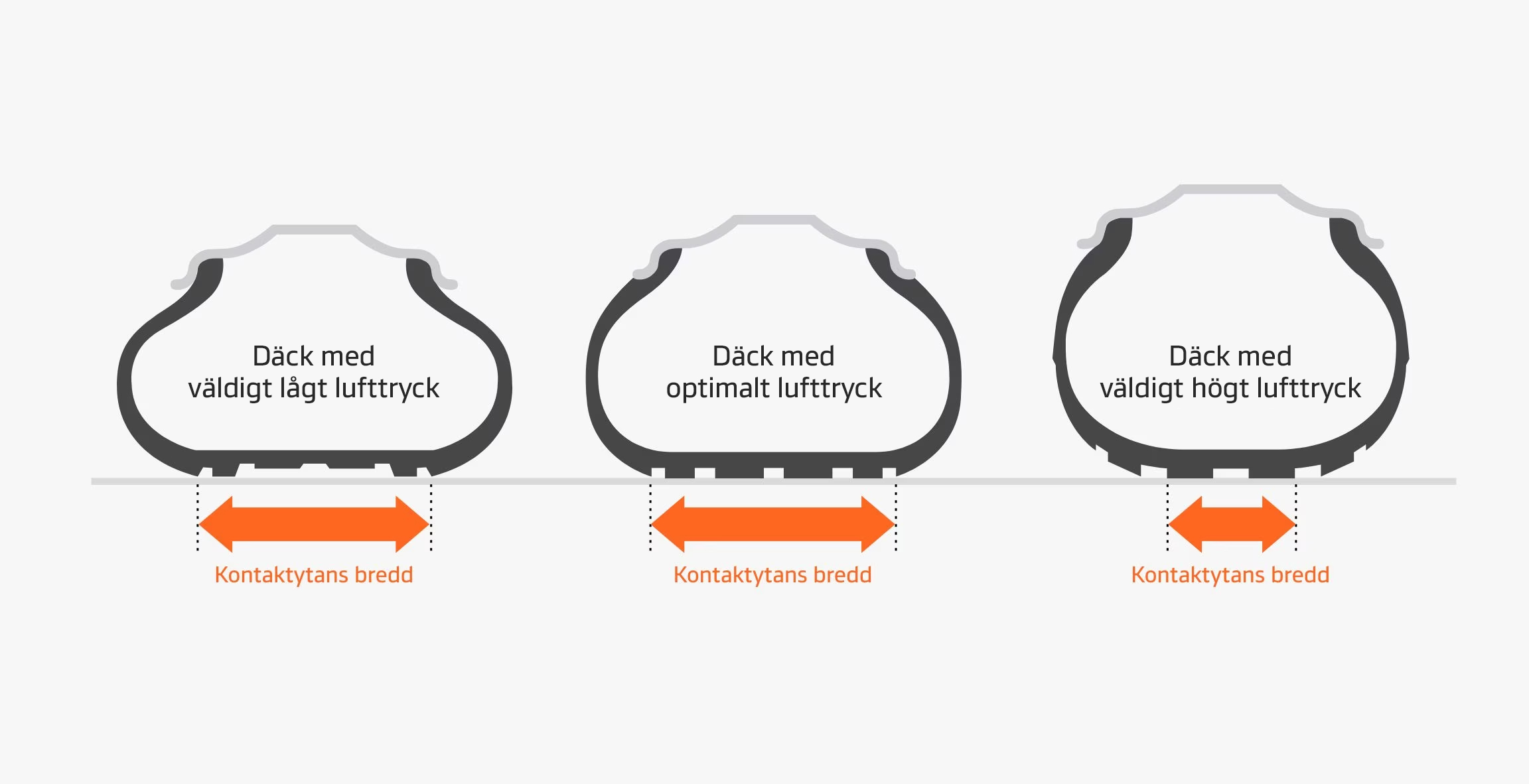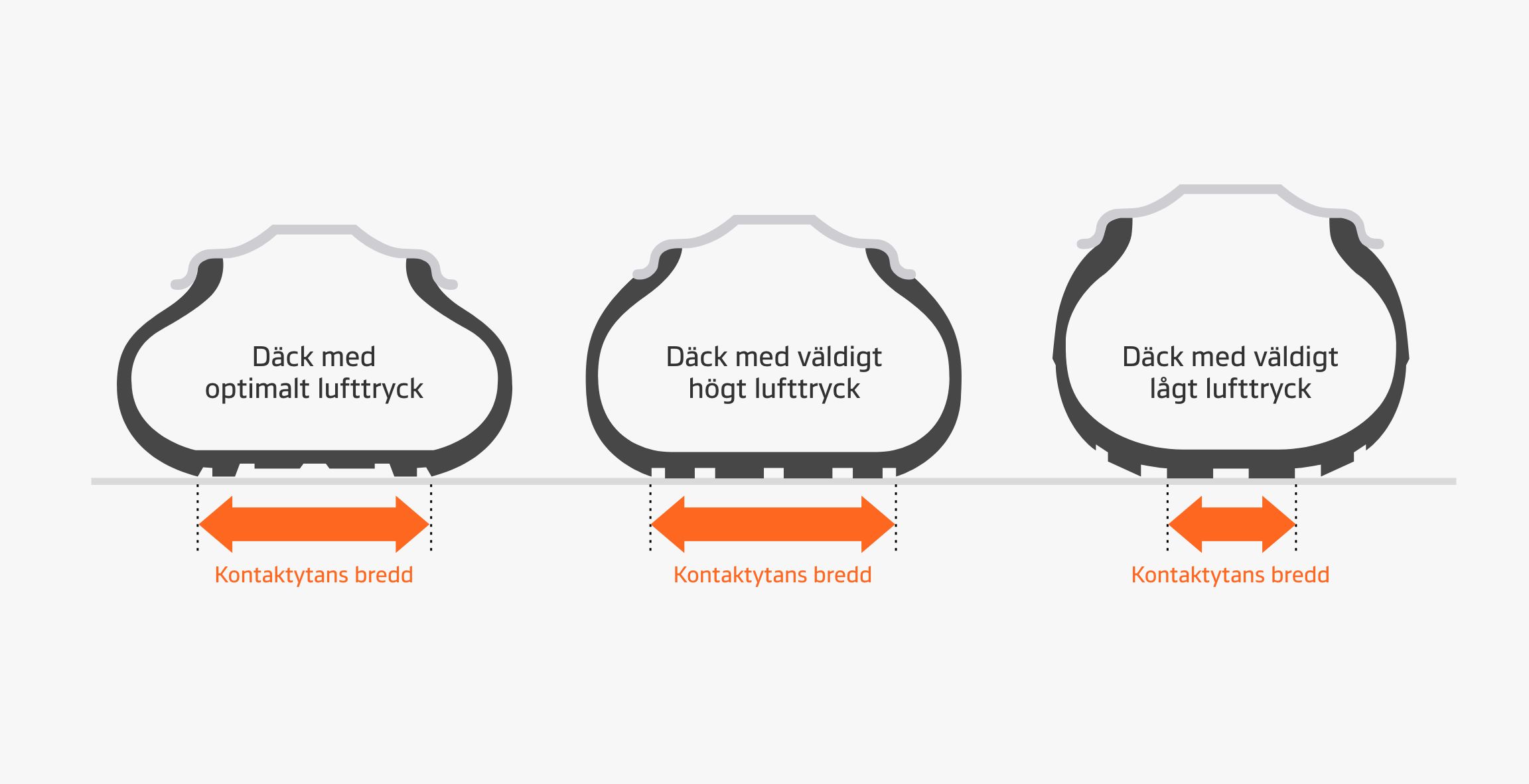 • Lågt lufttryck: Det gör kontaktytans bredd större, vilket resulterar i för mycket kraft på ena av slitbanans kanter. Yttre nötning kan skada alla delar på däcket. Det ger även en högre lutning på sidväggen jämfört med lutningen vid optimalt lufttryck, vilket kan vara farligt.