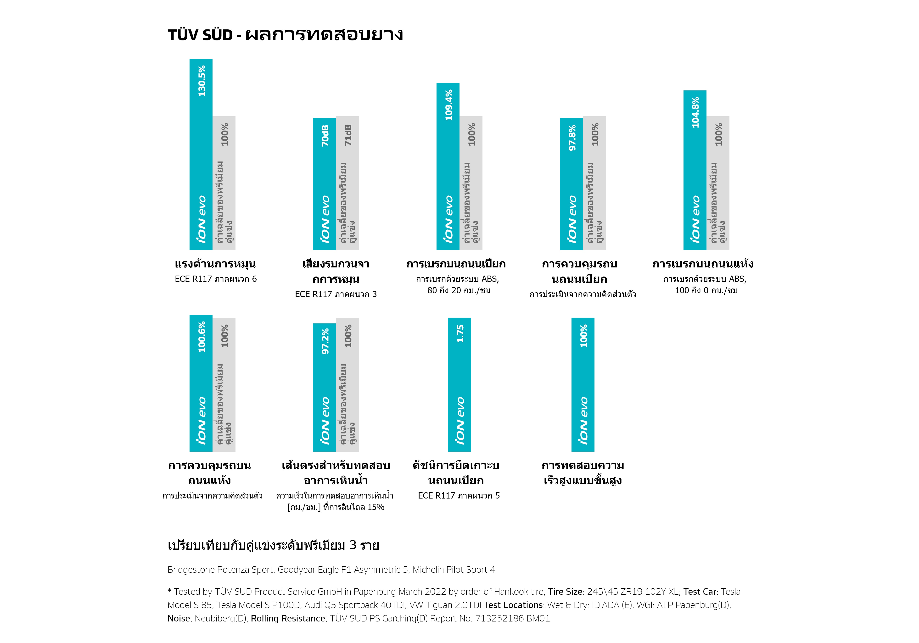 รถยนต์ไฟฟ้าแทบจะไม่มีเสียง จึงทำให้ผู้ขับขี่ได้ยินเสียงยางมากขึ้น ยาง iON evo ให้การขับขี่ที่เงียบและน่าพึงพอใจในทุกช่วงความเร็วด้วย i Sound Absorber Technology