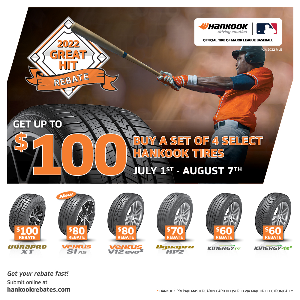 Nashville, Tenn. (July 1, 2022) – Leading global tire maker Hankook Tire announces its latest consumer promotion, the Great Hit Rebate. With the baseball season heating up this summer, Hankook will offer consumers up to $100 in savings on popular passenger, SUV and light truck tires. All rebates should be submitted online at hankookrebates.com, starting today.